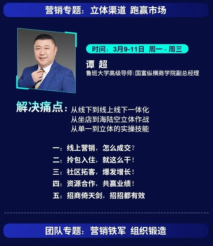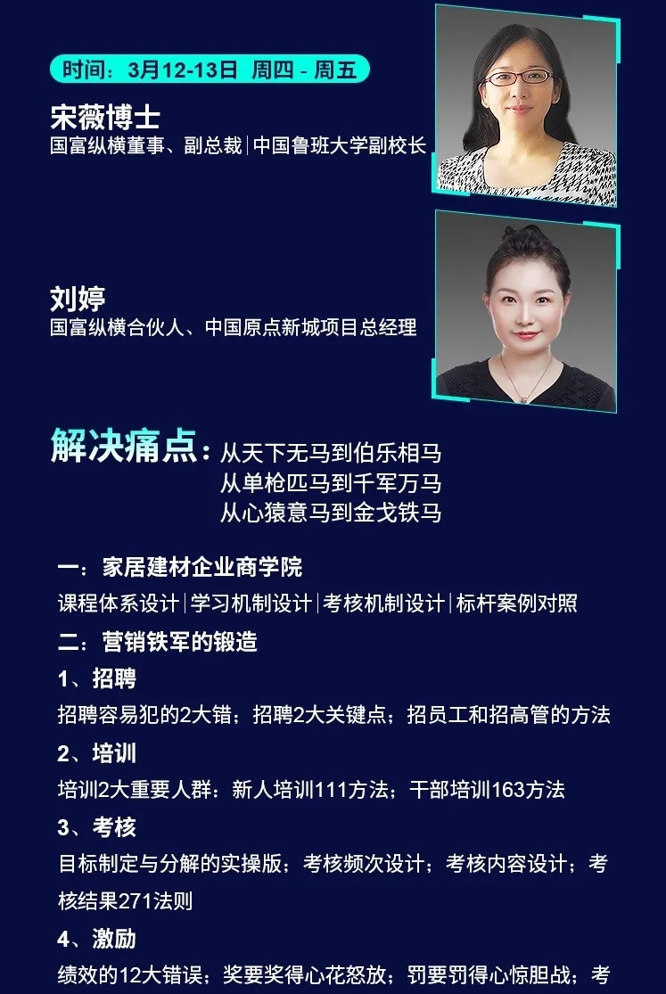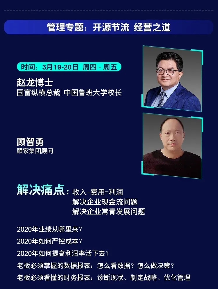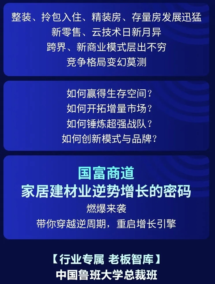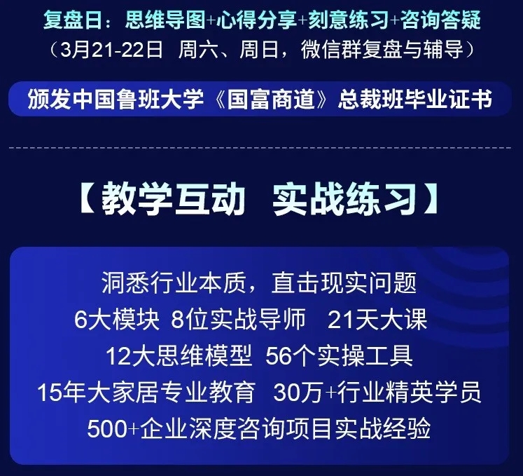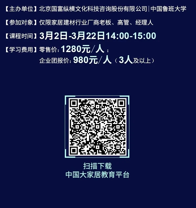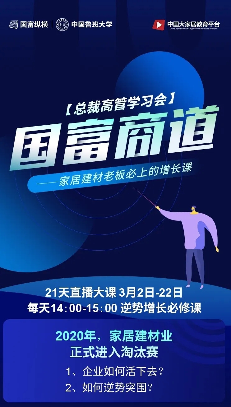 為了幫助家居企業(yè)在2020年逆勢突圍,中國魯班大學&國富縱橫重磅推出年度大課——《國富商道》,這是一堂2020家居建材老板必上的增長課,專門針對經銷商老板、中高管和生產企業(yè)老板、中高管的專屬課程。自3月2日起至3月22日,中國魯班大學&國富縱橫將通過21天的直播大課為您帶來大變局中的增長戰(zhàn)略,品牌逆勢的運營之道、營銷模式的突破之道、組織強大的鐵軍之道、用戶裂變的增長之道、精細管理的經營之道,一切精彩盡在中國大家居教育平臺,敬請期待!